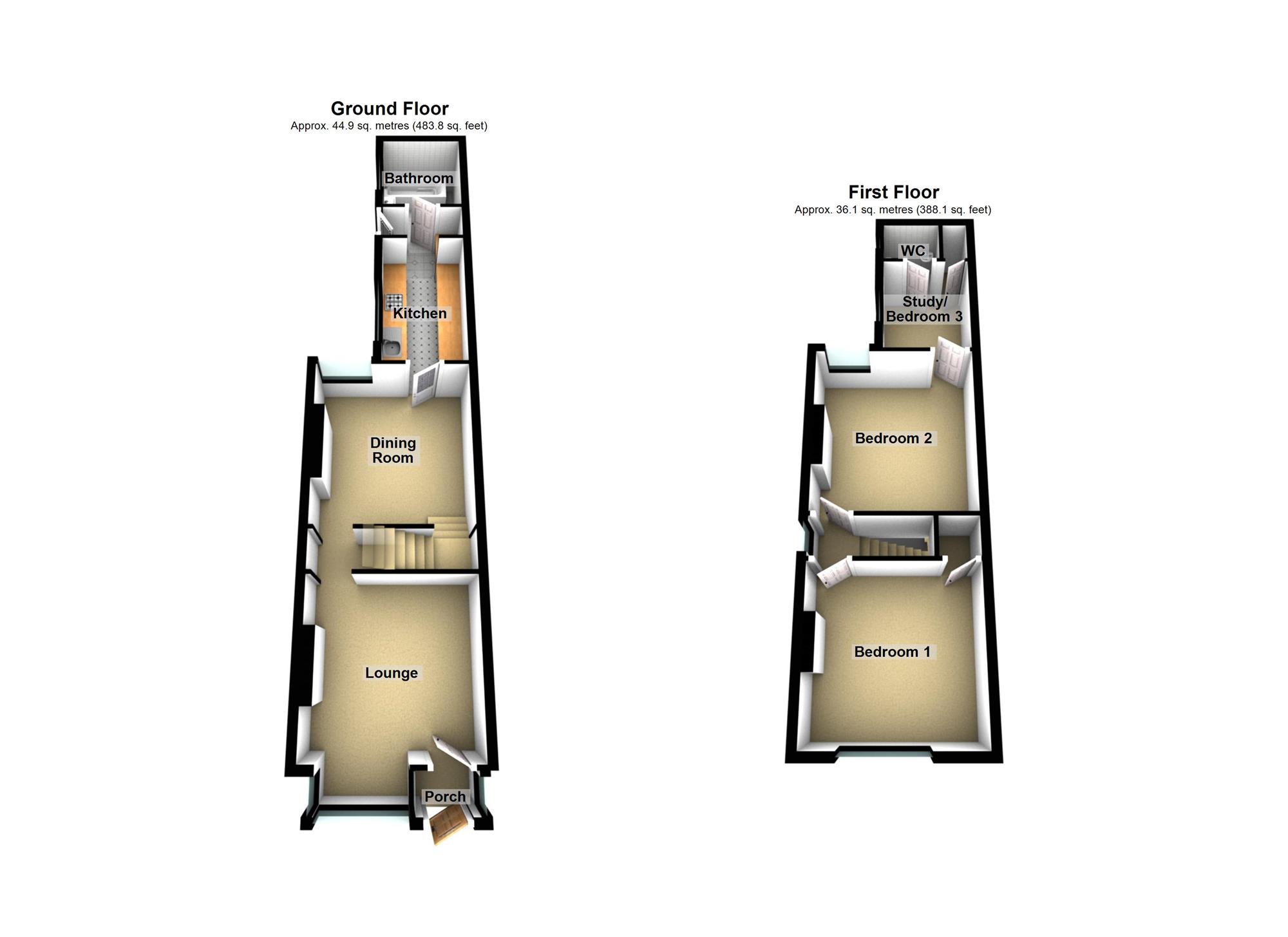 The property features a lounge, sitting/dining room, galley kitchen finished in a white satin style, rear lobby, and a ground floor bathroom with a suite in white to complement the living spaces. Additionally, there are two double bedrooms, and third bedroom off the second and a first-floor toilet.